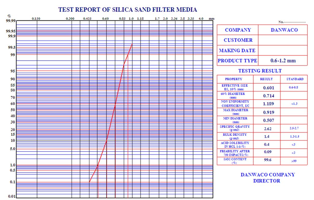 Cát trong tự nhiên chỉ chiếm khoảng 10% được dùng trong các bể lọc nhanh, 30% trong số ấy được dùng trong các bể lọc chậm. Lựa chọn hạt vật liệu liên quan đến kích thước hạt hiệu quả và hệ số đồng nhất là kỹ thuật tiến tiến mà ngày nay các nước tiên tiến đang áp dụng. Công ty chúng tôi trải qua nhiều năm kinh nghiệm, đã có thể chế tạo và cung cấp các bộ lọc cát có các đặc tính lọc nước khá lý tưởng. Toàn bộ sản phẩm của nhà máy đều trải qua qui trình kiểm tra nghiêm ngặt đảm bảo chất lượng tiêu chuẩn JWWA A – 103 của Hiệp hội cấp nước Nhật Bản.